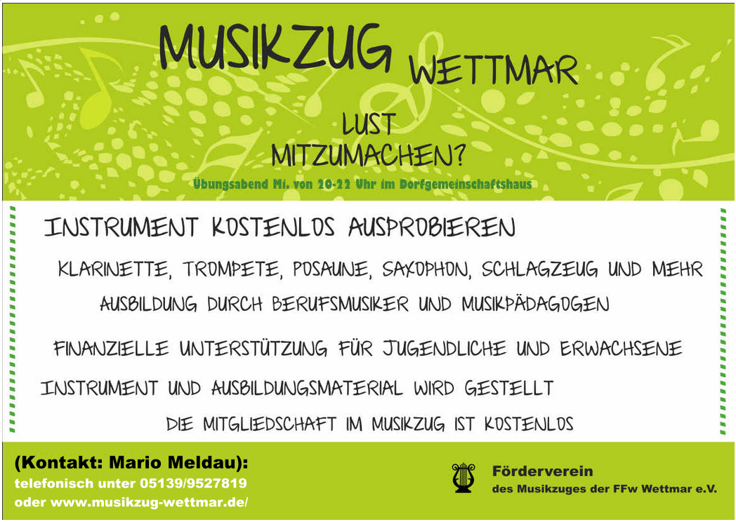 Der Musikzug ist der musikalische Mittelpunkt der Ortschaft Wettmar. Egal ob es sich um einen traditionellen Termin oder um Stimmungsmusik handelt, der Musikzug ist da, wo die Musik spielt!